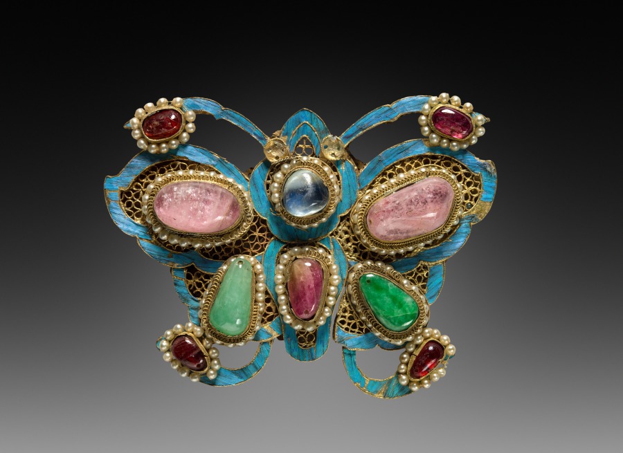 This buckle has a silver gilt base with kingfisher feather inlay work and is set with semiprecious stones.