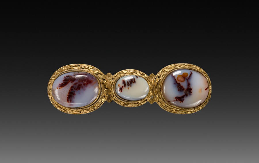brass or bronze gilt, engraved and set with three onxy stones
