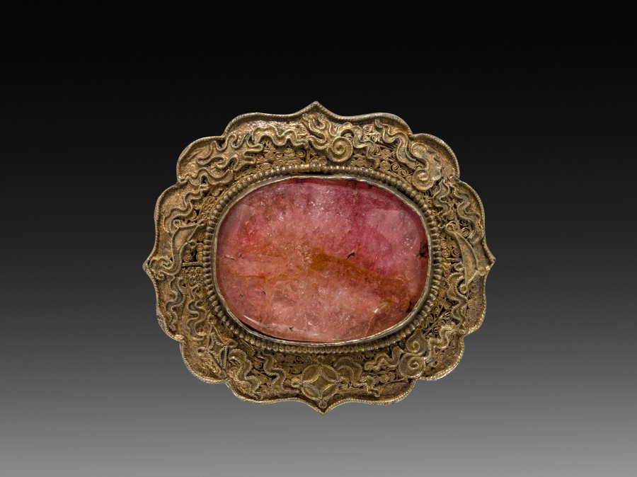silver gilt with filigree work, set with rose quartz