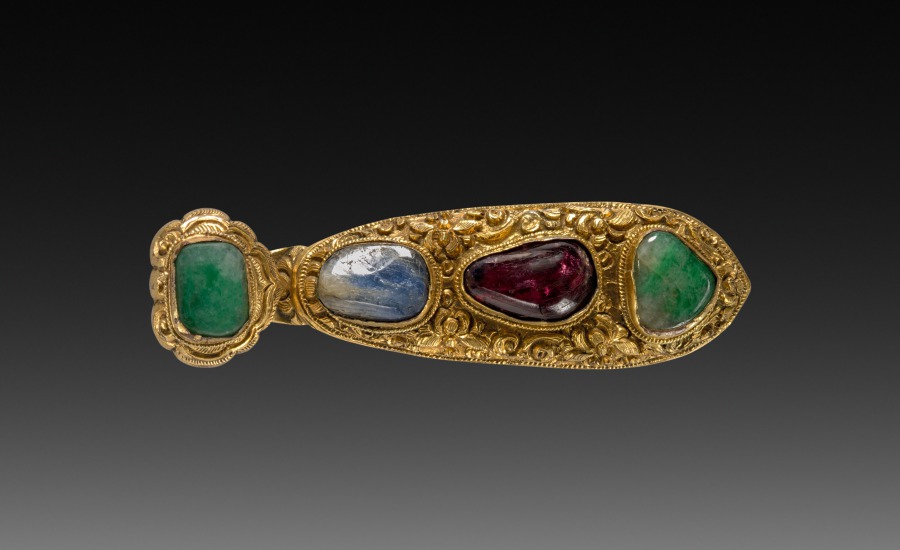 gilt brass, engraved and set with semiprecious stones
