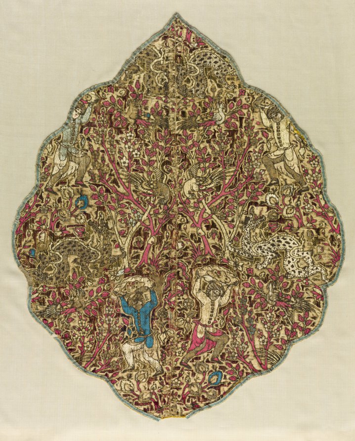 Iranian luxury textiles of the 16th and 17th centuries are renowned for representing human figures and for creating the most colorful velvets ever woven. Here, a dragon slayer dressed in 16th-century court attire is poised to hurl a boulder at a snarling dragon in a landscape with blossoming fruit trees and perched fowl. Even with faded silk pile this velvet contains many nuanced tones. As many as 12 colors of velvet pile were achieved by weavers who skillfully replaced colored pile warp during weaving. This velvet medallion decorated the interior of an imperial tent, possibly donated by Shah Tahmasp to an Ottoman Turkish sultan. Captured after the Ottoman siege of Vienna in 1683, the medallion was claimed as war booty by the European commander-in-chief Prince Sanguszko of Poland by whose name this and other panels are known.
