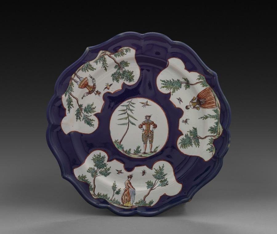 The use of colored ground with the irregularly shaped reserve panels with figural decorations reflects the influence of other European ceramics, particularly Meissen porcelain. The decorations of this plate are charmingly naive and demonstrate the efforts of Italian ceramic makers to keep abreast of current fashions in the field.