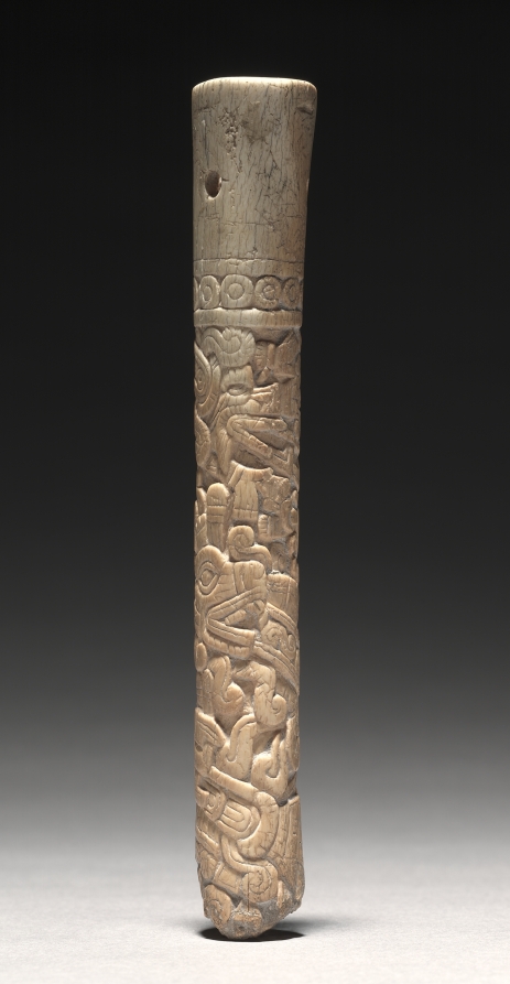 Carved in spiral registers, the ornamentation on this bone tube resembles Mixtec painting, both in codices (screenfold books) and architectural murals.