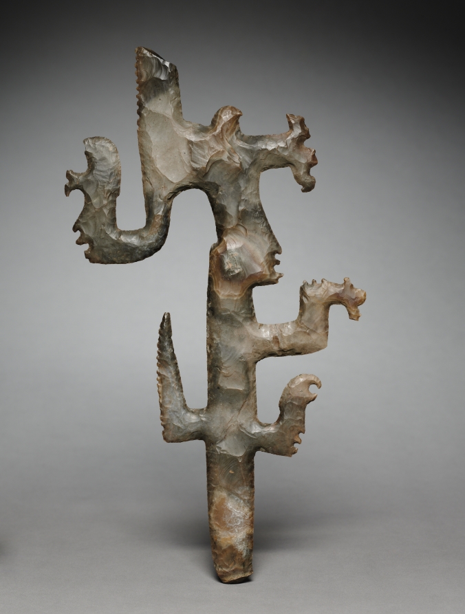 Named for their unusual shapes, eccentric flints often have intricately silhouetted figures like this. At the forehead of the main profile face is a smoking torch, the insignia of a deity closely linked to rulers and known today as K’awil. Smaller faces appear on three protrusions. Some flints may have served as scepters; they also were buried as offerings beneath buildings and sculptures.
