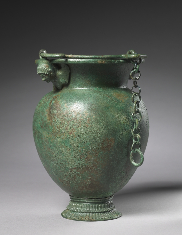 Known as a situla, or bucket, this bronze vessel features an ovoid body with a flaring neck. The separately made foot is quite elaborate and unusually shaped for this type of vessel. More typical is the handle, designed to swing upward from its two attachments, each finely cast in the form of a frontal siren with earrings and very small, simplified wings.