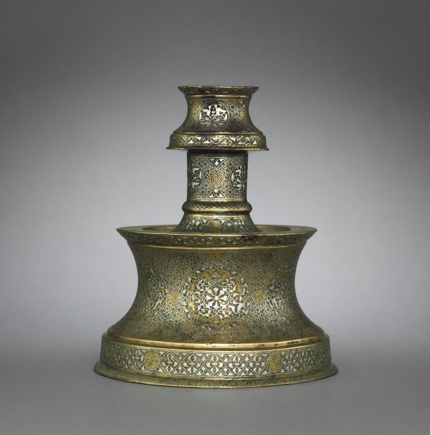 Candlesticks were a common type of luxury good in the Islamic world during the medieval period. The extensive decoration on this piece is arranged in bands with roundels displaying birds in flight and leaf-like scrolls on a background of hexagonal swastikas. These ancient motifs are thought to have been sun symbols and were sometimes used as a background pattern for metalwork at this time.