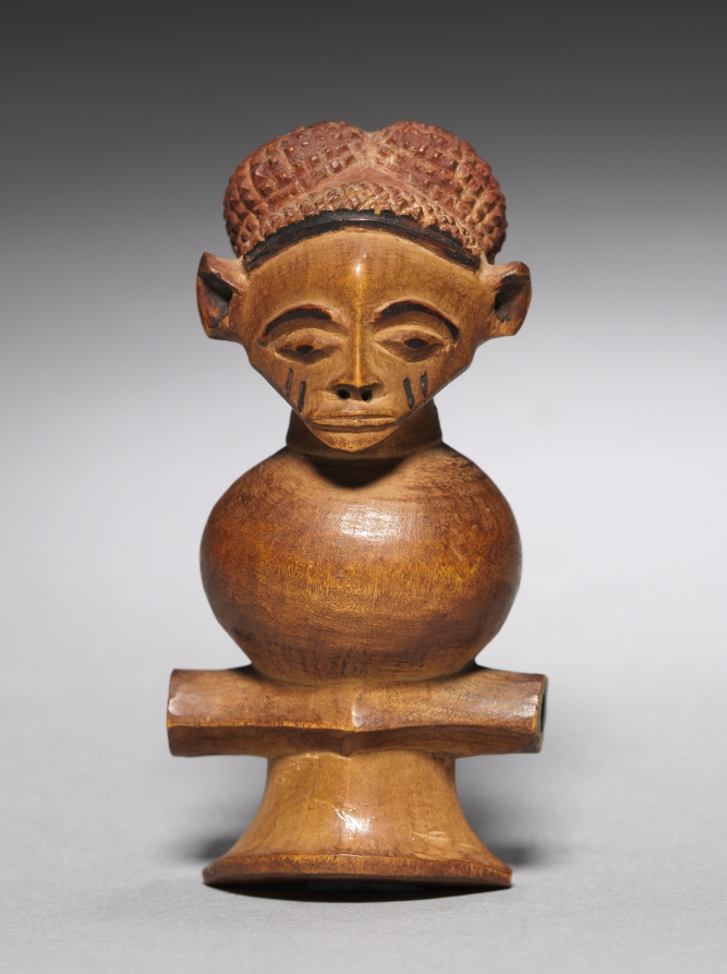 This small whistle displays a finely detailed head with bi-lobed coiffure similar to Pende masks.