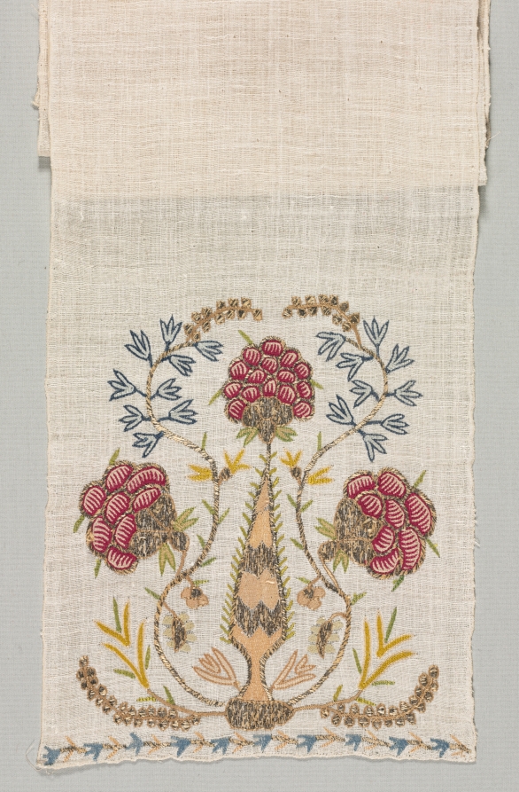 Each end of the sash is embroidered with a single motif of large-scale flowering plants. Below the main motif is a stylized foliate device forming a narrow border.
