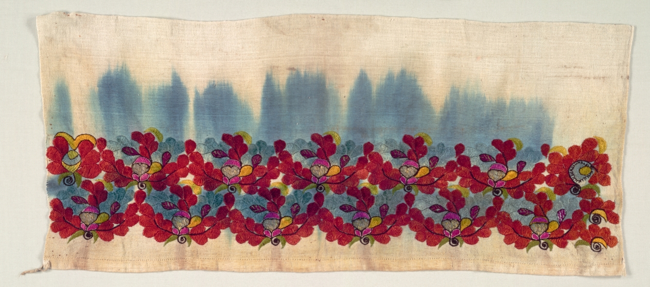 embroidery; silk and gold filé on cotton tabby