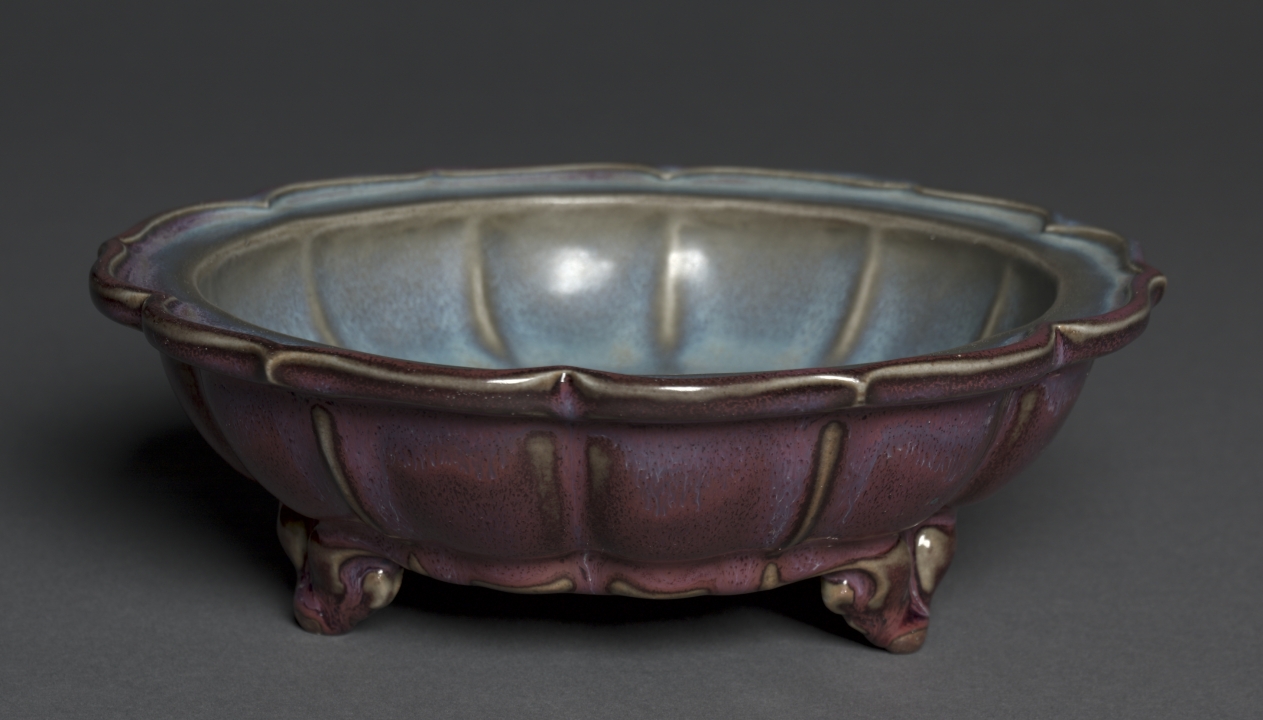Numbered Jun ware is inscribed with a number on its bottom—in this case number "two"—and is thought to have been made initially for the early Ming imperial court. The number indicates size, with "one" being the largest and "ten" being the smallest. Another characteristic is the "earthworm trail" left on the glaze surface, seen on the interior of this bulb bowl, where the opalescent blue glaze has cracked in several places during firing. The rich purplish tone on the exterior is the result of using copper pigment in the glaze.