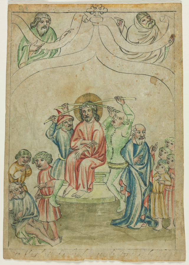 Also known as the "Poor Man's Bible," the Biblia Pauperum was a simple picture book used to explain biblical prophecies and symbolism. These volumes served as an aid for preachers to demonstrate the unity of the Bible. The iconography of these popular books juxtaposed two Old Testament scenes with one from the life of Christ. In this example, the image of Christ crowned with thorns. The Biblia Pauperum appeared first in manuscript form in the 1200s, became a popular picture book with miniatures in the 1300s, and after 1450 it emerged as a print book with woodcuts.