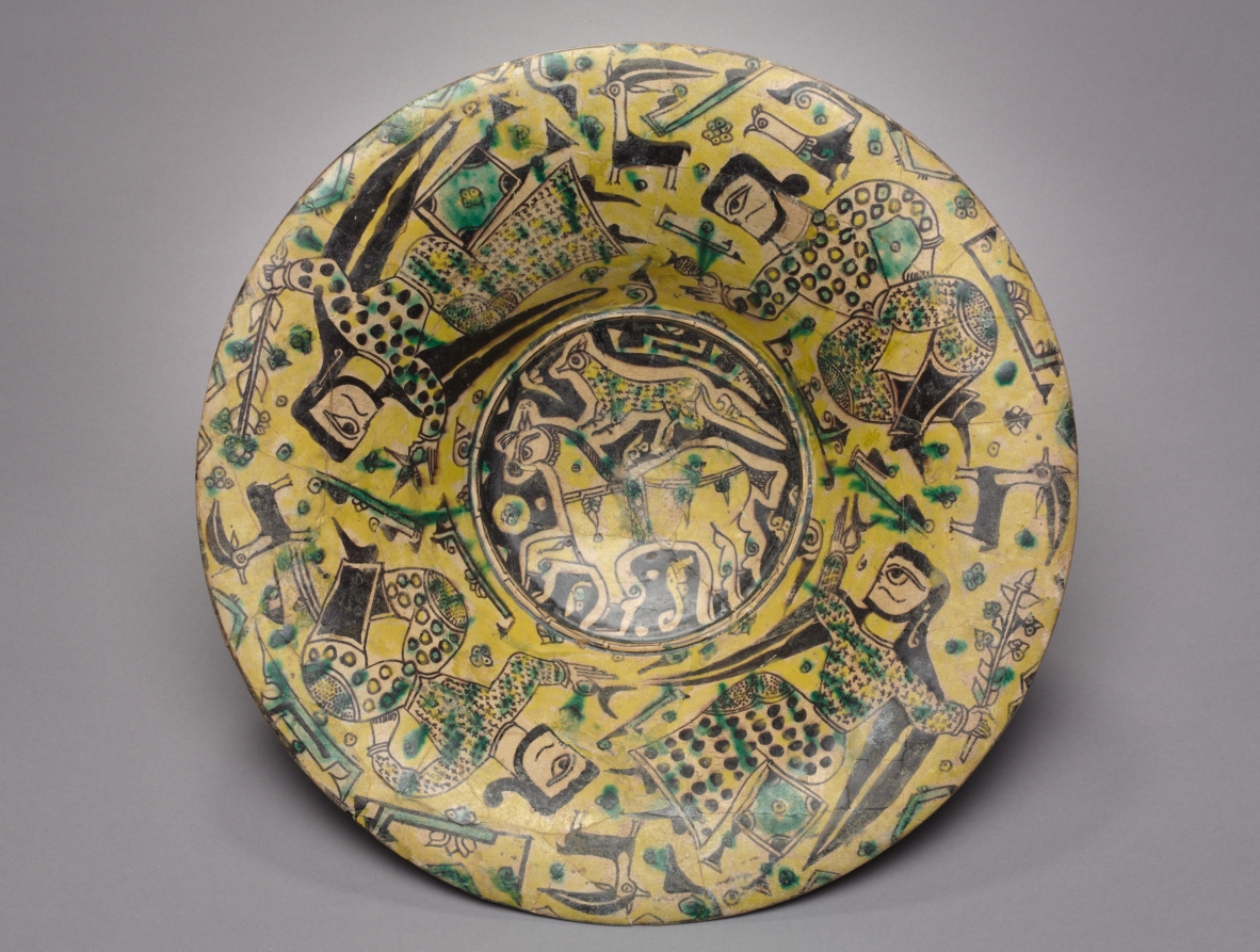 Nishapur was founded as a Sasanian imperial city and ceramics produced here regularly incorporate elements from Sasanian metalware. The lively decoration on this bowl features four bearded figures surrounded by animals, birds, and angular script (possibly extending baraka, blessing). The central horse with a cheetah on his back suggests an imperial hunt, a common theme in Sasanian and Islamic art. The decorative motifs and figures employed on Nishapur polychrome ware reflect the rich cultural traditions in this part of northeastern Iran. Some vessels, like this one, depict the pastime of hunting, others reflect festivals celebrated by Muslims and Zoroastrians, and a few display Christian symbols.