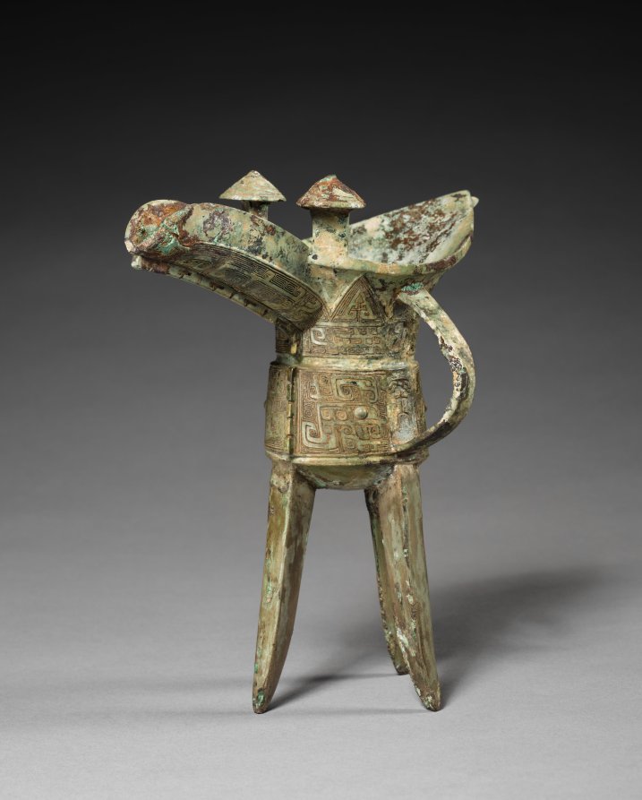 Wine and food played a major role in ritual offerings to the ancestral spirits and the Supreme Ancestor (Shangdi) performed by the Shang rulers in the state cult of ancestor worship. A variety of wine vessels—each type given a specific name—was cast to bear witness to the power and artistic vitality of this remote civilization. This example of a jue wine cup is for libations. Other major types of wine vessels include jia (wine warming vessel), fangyou (square wine container), and gu (beaker with a trumpeted mouth for pouring).