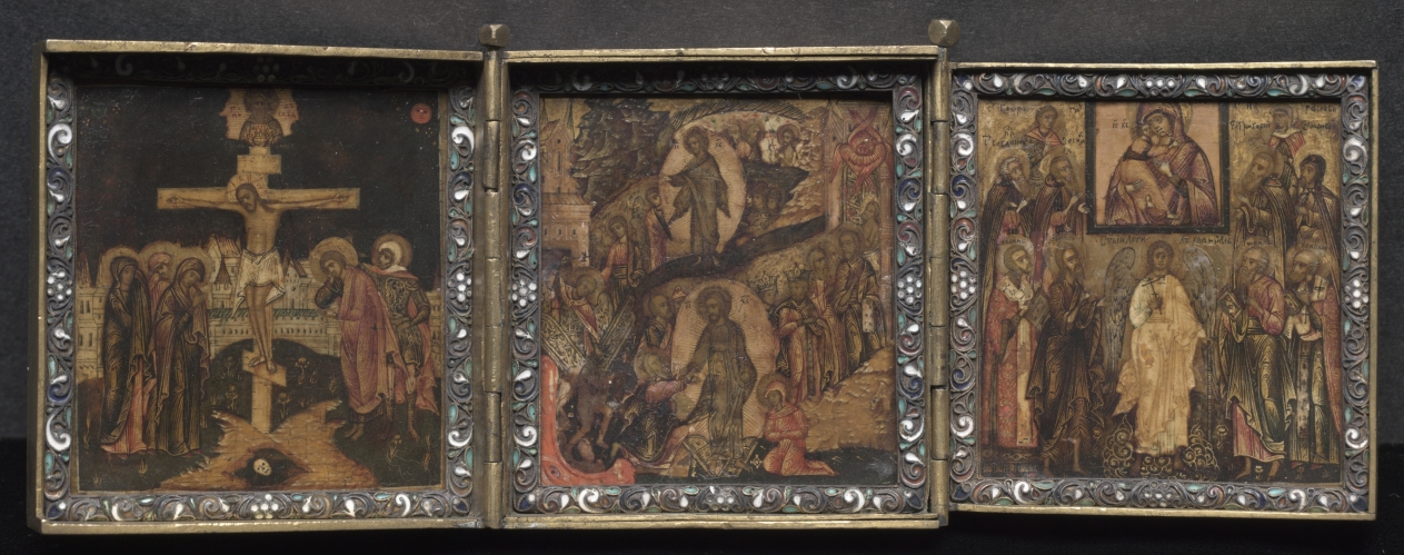 This triptych icon was probably commissioned by a lay person for private prayer and meditation. It could be folded and shut when not in use. The scenes represented from left to right are: The Crucifixion (left); The Resurrection and Anastasis (center); and Adoration of the Miracle-Working Icon of the Vladimir Mother of God (right). Small portable icons such as this were common to later Russian religious practice.