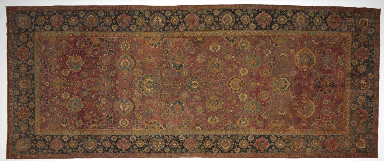The Mughals, with their nomadic Central Asian roots, were constantly on the move. They were adept at transporting the trappings of their residences and bases of operation from place to place. Fine carpets and canopies demarcated places of importance, and could be rolled up and moved when the ruler was ready to consolidate his power at a new location. When they settled in stone palaces in India, the interiors were covered with carpets, lending a warmth to the spaces that cannot be felt at the sites today. This carpet is of the type that the Mughals would have acquired for their residences. Mughal paintings are filled with depictions of carpets and textiles, many ornamented, like this one, with delicate and complex palmette-dominated arabesque patterns that evoke a paradisiacal setting.