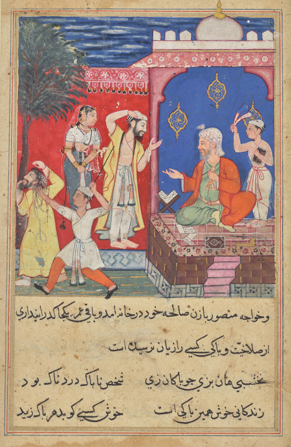 When the true merchant Mansur returns home to find an imposter in his place, he takes him to a judge to settle the matter. After testimony of Mansur’s wife, the imposter is revealed. In the image, the real Mansur stands with his wife, addressing the seated judge. Below them, the imposter is led away, turban unraveled, while being beaten with a stick.