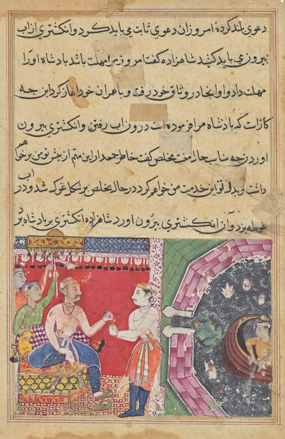 The prince arrived at a royal capital, where he pledged to assist the local king in any tasks. One day, when fishing at sea, the king dropped a precious ring into the water. The prince asked his servant, the frog, to retrieve it. At the left, the prince respectfully returns the ring to the king on his throne. The frog is at the entrance of the walled harbor to the sea, where a boatman bails water. Lotus flowers have been painted among the swirling eddies.