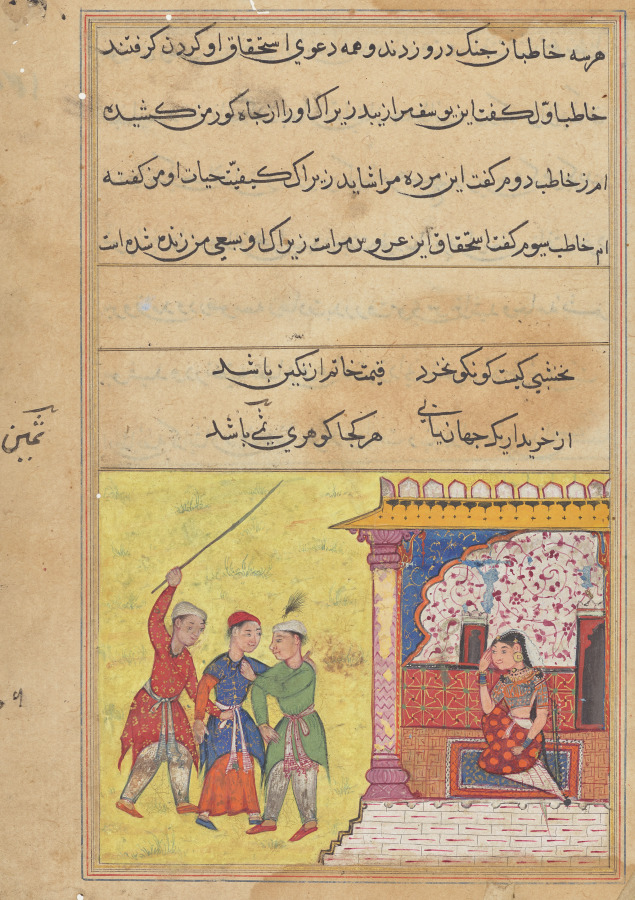 After working together to revive the woman from her death-like illness, the three suitors resume their rivalry. The men brawl in the courtyard while she looks on from her chamber. Horrified by the behavior of her suitors, she renounces worldly matters, joins a temple, and devotes herself to serving god.