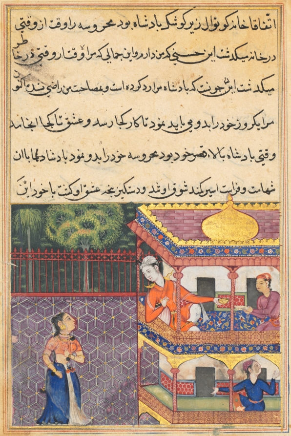 The king peers into the courtyard from the balcony of his palace. Upon seeing Mahrusa, he is immediately captivated by her beauty and falls deeply in love despite his vizier’s attempts to keep them apart. The king is so enamored with Mahrusa that he becomes lovesick and ultimately dies.
