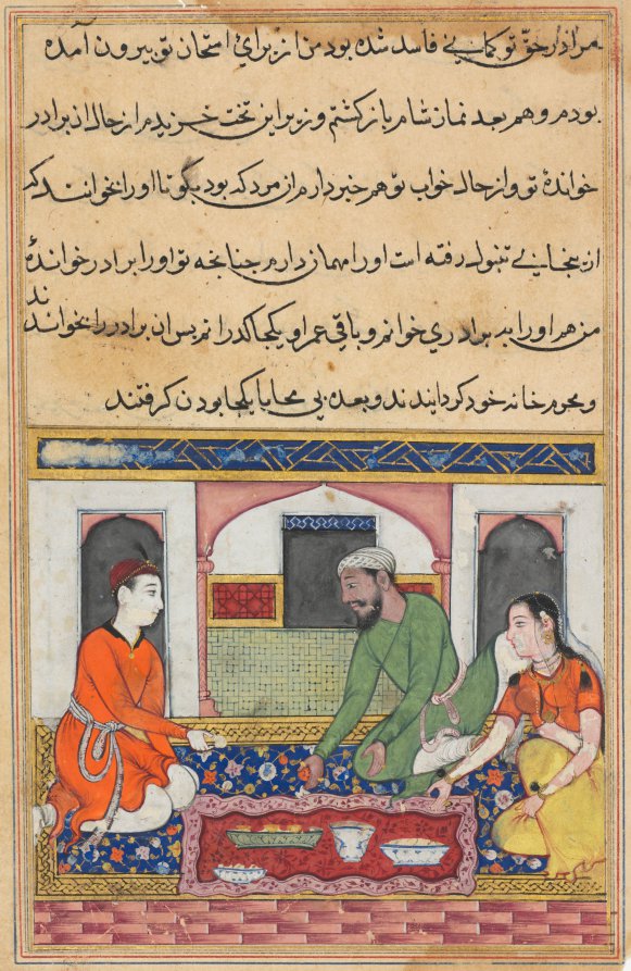 Shahr-Arai and her husband sit together on the right, offering food to Shah-Arai’s lover. She has successfully tricked her gullible husband, and he gladly welcomes the young man into their household. From this point on, the three live happily together—the husband never uncovering the truth of Shah-Arai’s deception.