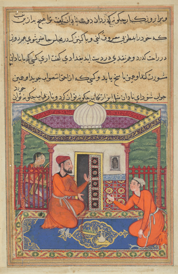 The young man, on the right, shares his problem with his friend. His lover, the slave girl, waits in the background, harp in hand. The man has squandered his riches and now seeks a way to earn them back. His friend suggests that he should become a musician and entertain nobility. Finding this advice degrading, the young man declines and decides to sell the girl.