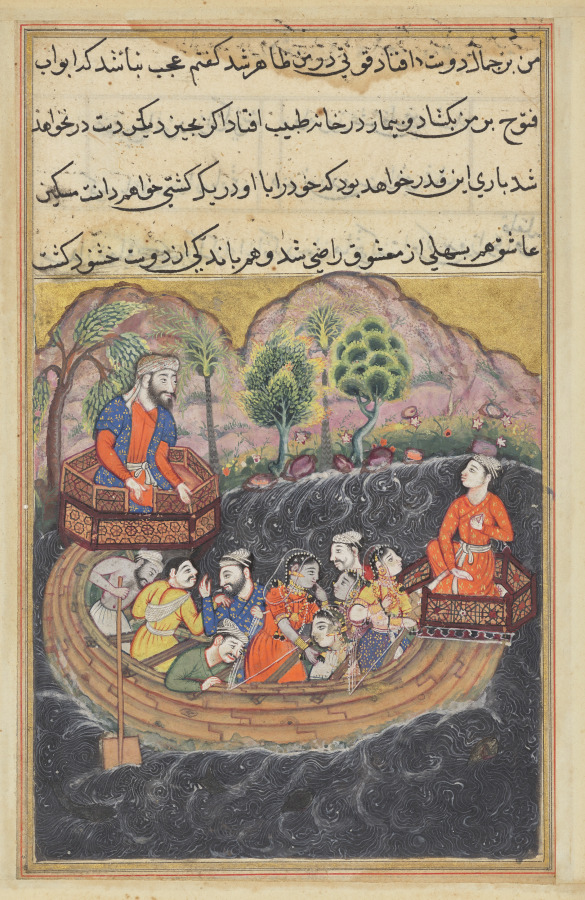 After losing all his possessions, the destitute young man joins the crew of a merchant ship. Upon boarding, he quickly realizes that this ship belongs to the same merchant who purchased his lover, the slave girl. She stands in the center of the boat, her finger raised in a gesture of shock, gazing toward her long-lost love.