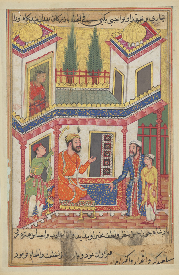 The princess of Rum watches anxiously from an upper window as her son is introduced to the enthroned king. In order to hide his identity, she has told her husband that the young man has expert knowledge of precious gemstones. The king, impressed with the slave’s skill, welcomes him into his court.