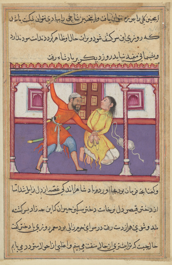 The king, mistakenly believing that the princess’s secret son is her lover, orders him to be executed. The young man is shown with hands bound and long hair in disarray; his unraveled turban lies on the ground at his side. Just before the guard can behead him, the princess’s son reveals his true identity, and his life is spared.