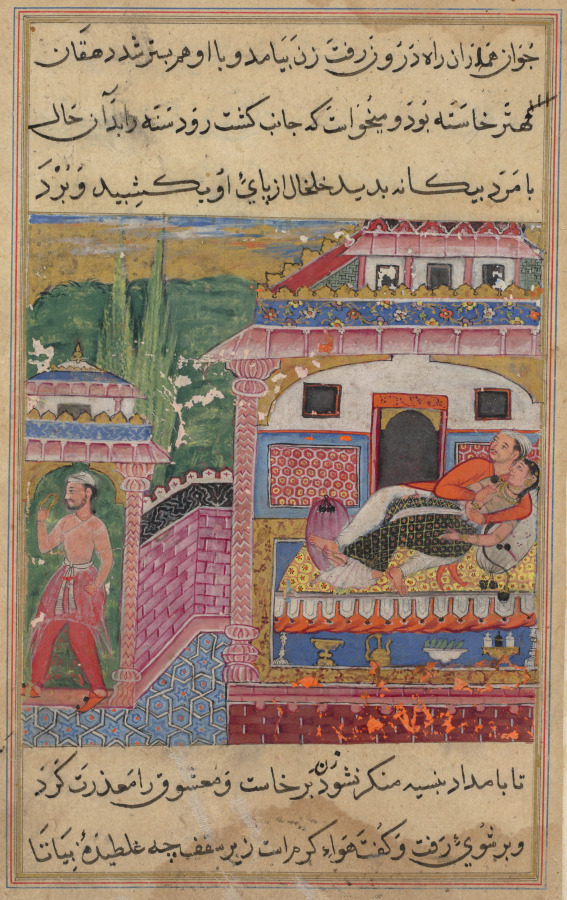 The unfaithful wife and her lover were discovered by her father-in-law in their rendezvous place. Thinking she was asleep, he took her anklet as evidence of her infidelity, planning to confront her with it later. The lovers, still in bed, were awakened and witnessed him leaving by the gate, holding her anklet. Under the bed are a pitcher and basin for water, a dish of breath-freshening and mildly narcotic pan leaves, along with bottles of perfumes, all the accoutrements for a romantic encounter.