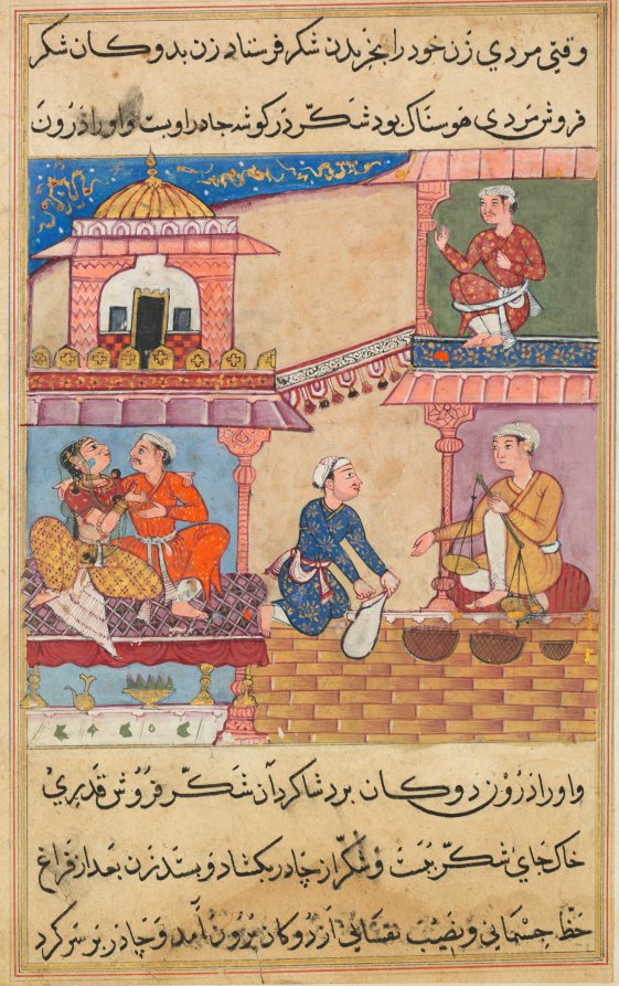 While buying sugar at the market, a woman has an impromptu affair with a merchant. The two lovers embrace in the chamber on the left. Outside the chamber the merchant’s clerk, wearing blue, surreptitiously replaces the adulteress’s sugar with gravel. Unaware of the switch, she will bring the bag of gravel back to her husband, who reacts with surprise and consternation