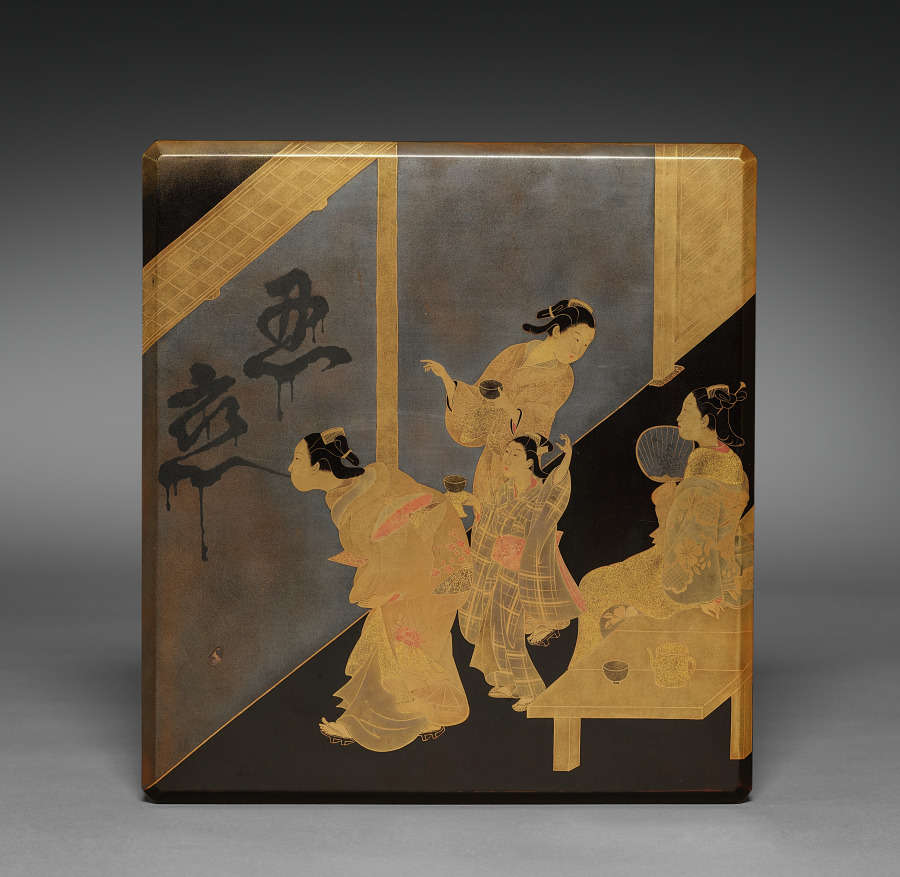 The design on this writing box shows a courtesan who has just completed an impressive feat of spitting the term shinobukoi (忍恋), which could be translated as “hidden love” or “unrequited love,” on an earthen wall. The phrase appeared in classical Japanese poetry anthologies produced by nobles writing in ink on the finest decorated papers. Here, the confining walls of the brothel district become a space for public announcement in graffiti, with the medium being perhaps tea.