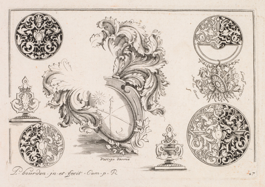 This etching is from a set of prints showcasing decorative patterns by Bourdon. The title page for the set explains that the designs are “useful for clockmakers, goldsmiths, chiselers, engravers and other people.” These craftsmen who made ornamented objects sometimes consulted printed designs for inspiration. However, pattern prints similar to Bourdon’s also catered to aristocrats and wealthy professionals who pursued knowledge about artists and current styles.