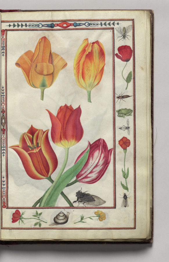 Tulips with Poppy, Carnation, Snail, Bug, and Frog Border, folio 3 (recto), from Florilegium (A Book of Flower Studies)