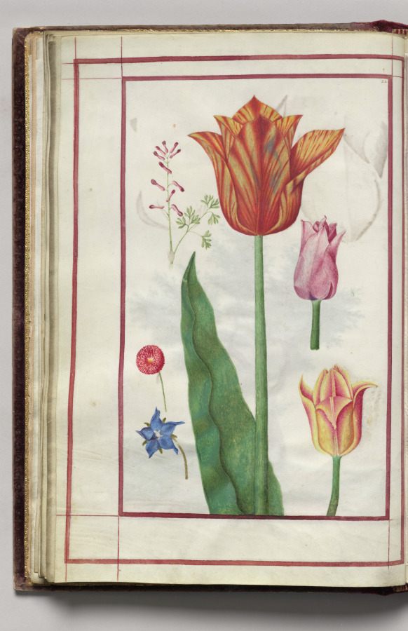 Tulip, Pink Dicentra, English Daisy (Bellif), and Borage, folio 13 (verso), from Florilegium (A Book of Flower Studies) by — VisualArtsDB