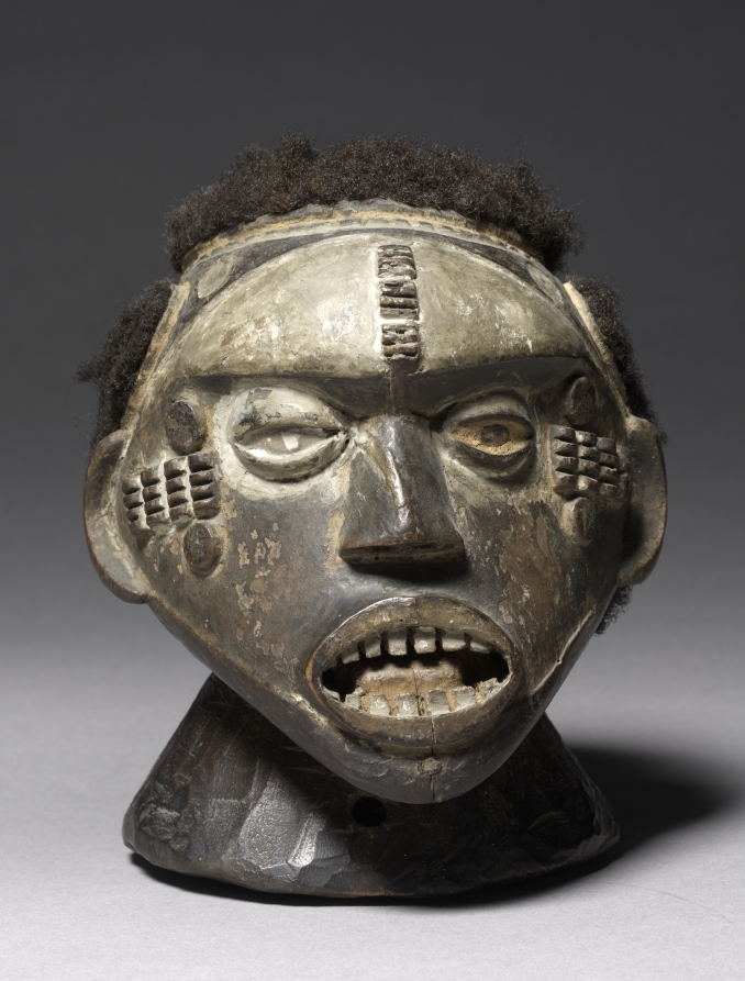 This was used in masked performances of the Agrinya society, a powerful guild formerly restricted to men who had killed an elephant, lion, or man. The white pigment connotes the realm of the ancestors, while the aggressive expression of the face seems to suggest the courage of Agrinya society members.