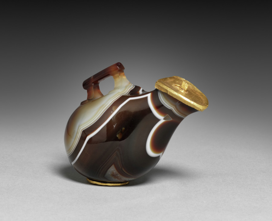This miniature vessel was carved from a single piece of banded agate, polished to a shine, and embellished with a gold lid and gold details on the base. Inside the ring of gold at the base is a trio of gold papyrus stalks, a likely reference to Egypt. In shape, it resembles an ancient wineskin, or askos, though its small size suggests use for luxury perfumes or oils. A tiny crab, likely once inlaid with a precious material, has been carved behind the handle.