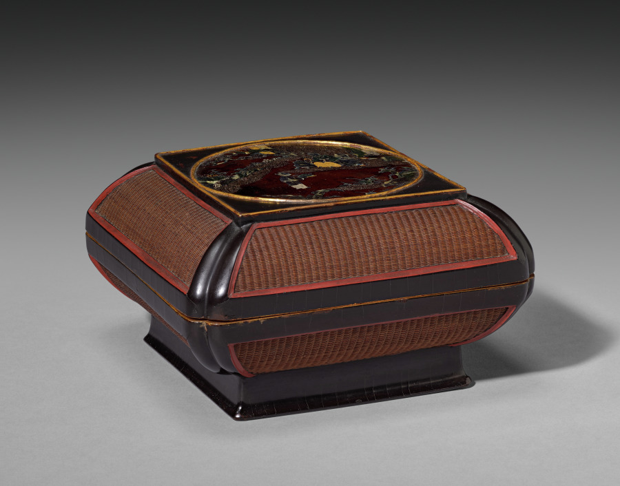 lacquered wickerwork (of woven bamboo) framed in wood with circular scene inlaid in mother-of-pearl and gold
