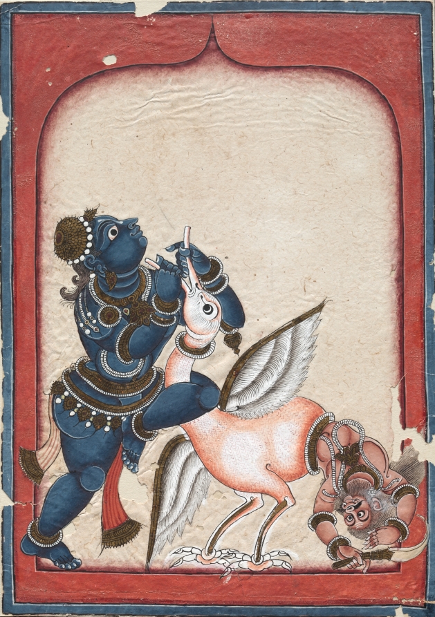 The Hindu god Vishnu incarnated himself as Krishna in response to pleadings from the Earth goddess to rid her of a wicked king. The king sent demons of many forms to assassinate Krishna, who effortlessly destroyed them. The South Indian artist effectively used a diagonal composition to show the cause and effect of Krishna’s assault and the fall of the defeated demon.