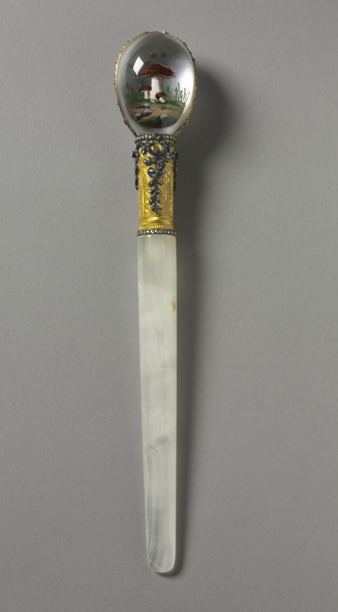 - blade: agate; collar: transparent yellow enamel on an engine-turned ground mounted in gold set with diamonds, and the ovoid finial of two pieces of rock crystal carved on flat surfaces