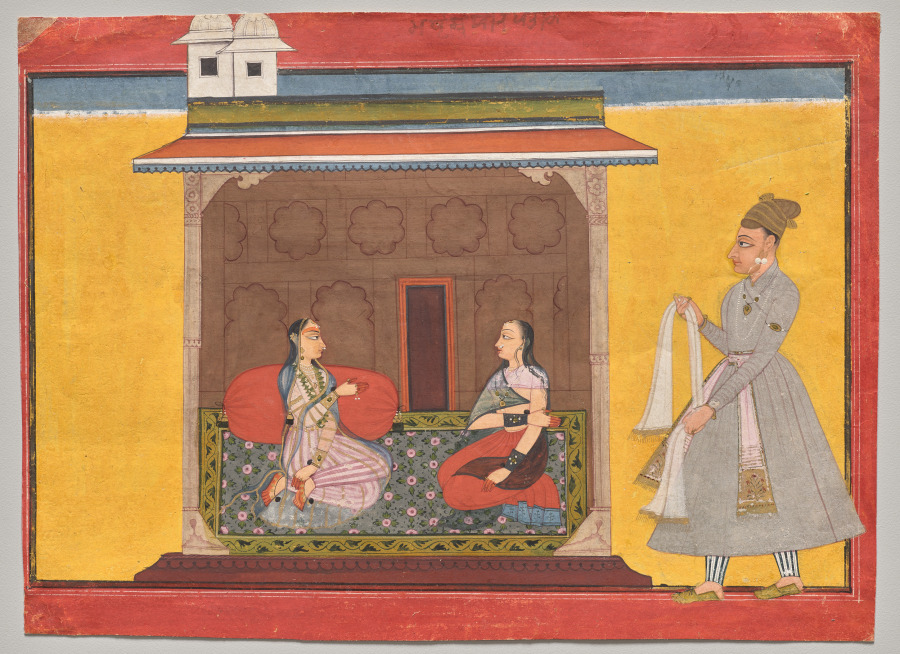 The heroine sits in front of the elongated red cushion, gesturing to her companion in conversation. She is trying to decide if she should agree to submit to her husband or continue to be coy. A verse from a Sanskrit poem by Bhanudatta Misra, who lived during the late 1400s to early 1500s in northeastern India, has been quoted on the back of the painting. The verse has been written both in Sanskrit using the Takri script of the Pahari region and in a local vernacular translation.