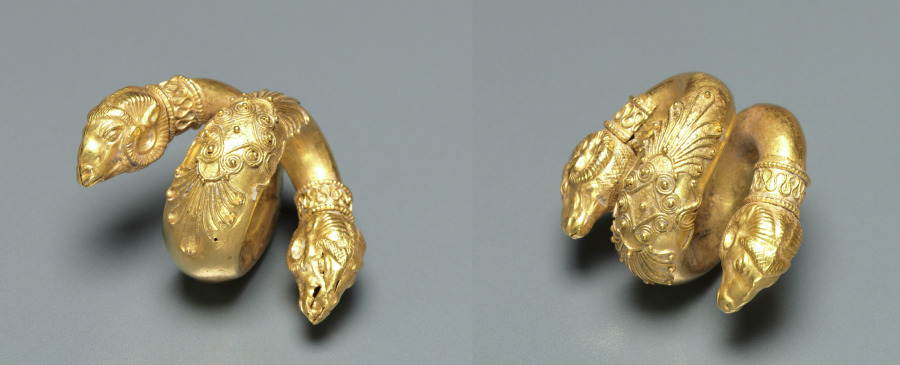 The main spiral body of this ornament is made from a hollow tube, decorated in the center with a double palmette. Each end of the ornament is capped with a ram’s head above an elaborate collar. There are no join seams on the main tube, meaning it must have been cast as a spiral or otherwise as a tapered tube that was then bent into shape. Scholars believe that these helical pieces were used as earrings (perhaps with a separate attachment) or to hold hair in place.