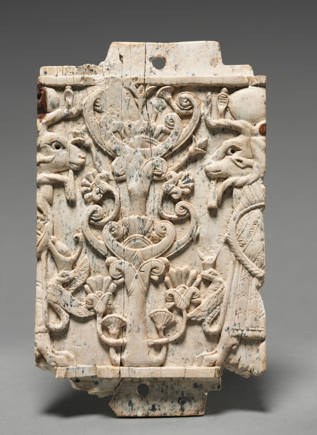 Decorative Plaque: Ram-Headed Sphinxes Flanking a Sacred Tree by — VisualArtsDB