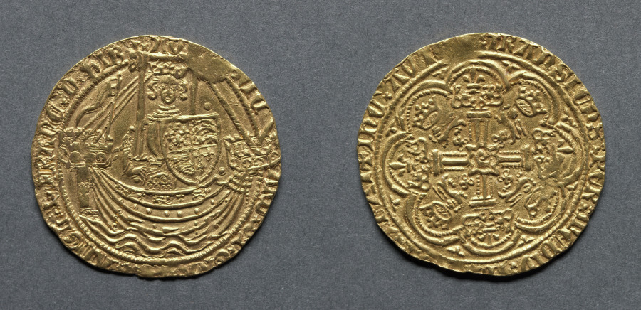 This type of coin is very similar to that of the last right but a flag or pennant has appeared on the stern-castle of the ship. This signifies that the piece was struck in the Calais mint, then, and for 180 years to come, an English possession. There are three other points of interest in the Nobles of this period. First some of the early pieces of the reign were struck from the dies of the previous king, Edward III. Secondly, a symbol, such as a lion, trefoil or crescent was sometimes placed on the ship's rudder. Fours such marks were used, their purpose being to distinguish different issues. Finally, four styles of lettering were used.