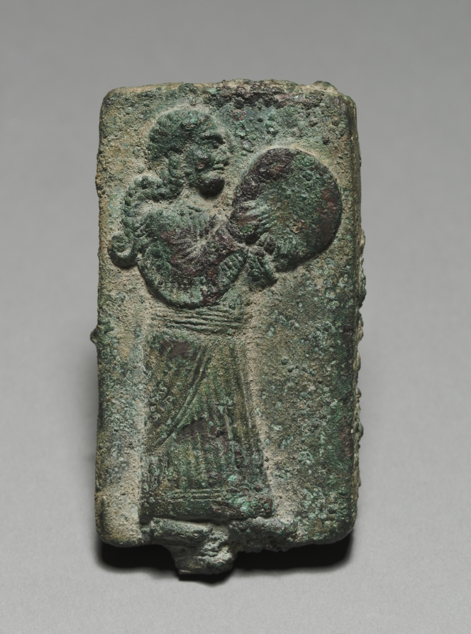 This plaque is probably one of several that decorated the side of a throne. The man's hair and costume are similar to those on the huge wall relief, and they are probably about the same date.