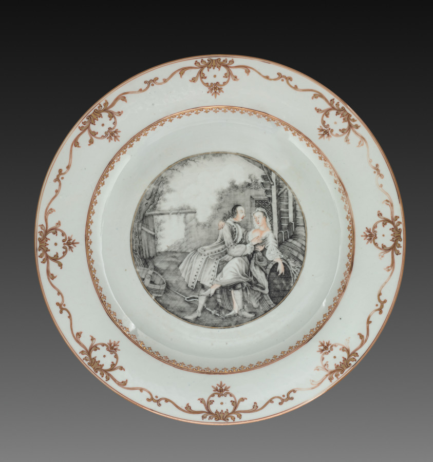 This plate demonstrates the commercial exchange of products—in this case prints and porcelain—between Europe and Asia in the 1700s. Here, a Chinese porcelain factory adapted a French print to decorate a dish for the European market. It depicts a fable by Jean de La Fontaine in which a barrel-maker’s wife dallies with a lover while her husband is working.