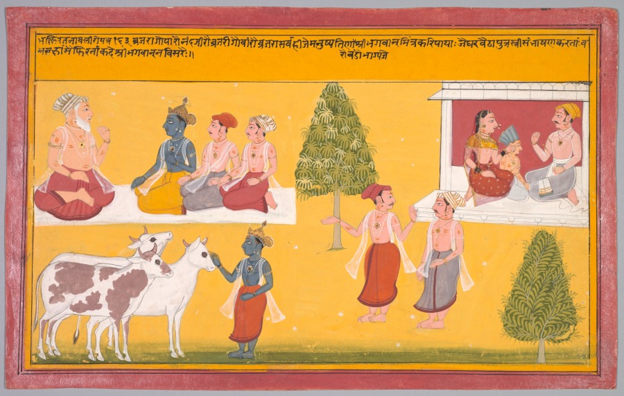 In the upper left vignette, the blue-skinned Krishna sits with two of his friends before Nanda, his foster father and head of the cowherd village in Braj, where he spent his youth. Below, he interacts with three adoring cows. The scene in the upper right corner accords with the end of the verse at the top of the page, which reads, “The one who speaks about him to his wife and son at home will never be abandoned by him.” The text is drawn from a compendium of devotional verses excerpted from the extensive Bhagavata Purana by the medieval commentator Vishnu Puri.