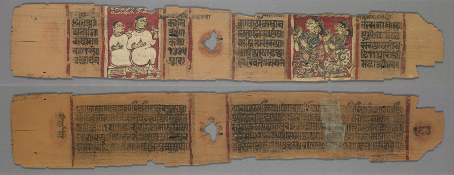 This page is from the end of a manuscript, which contains two texts often paired together, the Kalpa-sutra and Story of Kalakacharya. The latter tells a story about a Jain teacher who used magic to overthrow an evil king. The lay women who listen reverently to the nuns’ teaching may be the donors who paid for the creation of the manuscript.