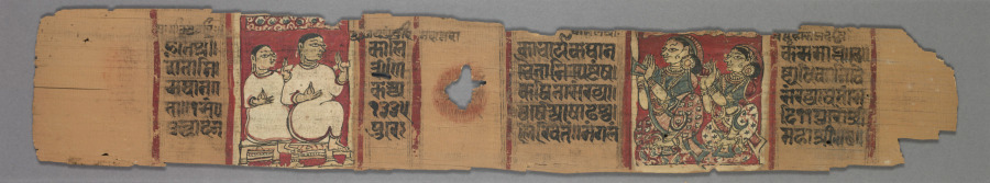 Wearing white billowing monastic robes, the two nuns contrast with the beautifully adorned laywomen, who wear elaborately patterned textiles and jewelry. Jains commissioned illuminated manuscripts as a way to accrue religious merit, and they would have images of themselves at prayer inserted into the image cycles like this as signs of their patronage.