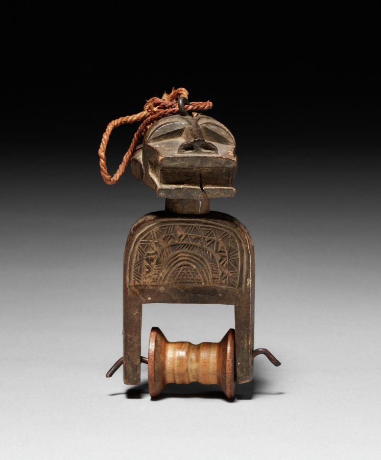 The heddle pulley, a working element of a narrow-band loom, bears a miniature sculpture. Heddle pulleys support and separate threads during weaving. Mounted above the weaver, the pulleys allow him to glance up at an object of inspiring beauty, rather than pure functionality. This pulley depicts a face mask, a secular usage of a typically sacred mask type.