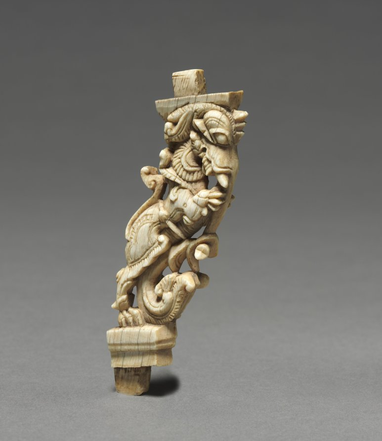 Composite creatures with the body of a lion, tusks and trunk of an elephant, and horns of an antelope are standard elements of medieval Indian architecture and furniture. Traces of pigment indicate that this work was once brightly colored.